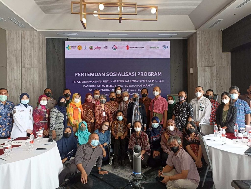 TRACE was a project funded by the Australia Indonesia Health Security Partnership (AIHSP) through Save the Children with the goal to support the Government of Indonesia in accelerating efforts to expand COVID-19 vaccination coverage and implementing preventive behaviors in four priority provinces. Particularly, the project targeted the vulnerable population groups at risk of COVID-19 —namely, the elderly (over 60 years of age), people with disabilities, and unvaccinated people as a result of social and economic factors— to enable them make informed decision to protect themselves and their families from the disease. As critical components of the project, it emphasized gender equality, disability, social inclusion (GEDSI), and child protection. All activities had to consider how health policies impact women and men from different backgrounds and contexts and respectively children who were deemed vulnerable groups. This project used the risk communication and community engagement (RCCE) framework, which is a critical component in health emergency preparedness and response activities. RCCE framework is important in building a coordinated, clear, and credible communication system to minimize the health, social, and economic impact on the population, especially the vulnerable groups.